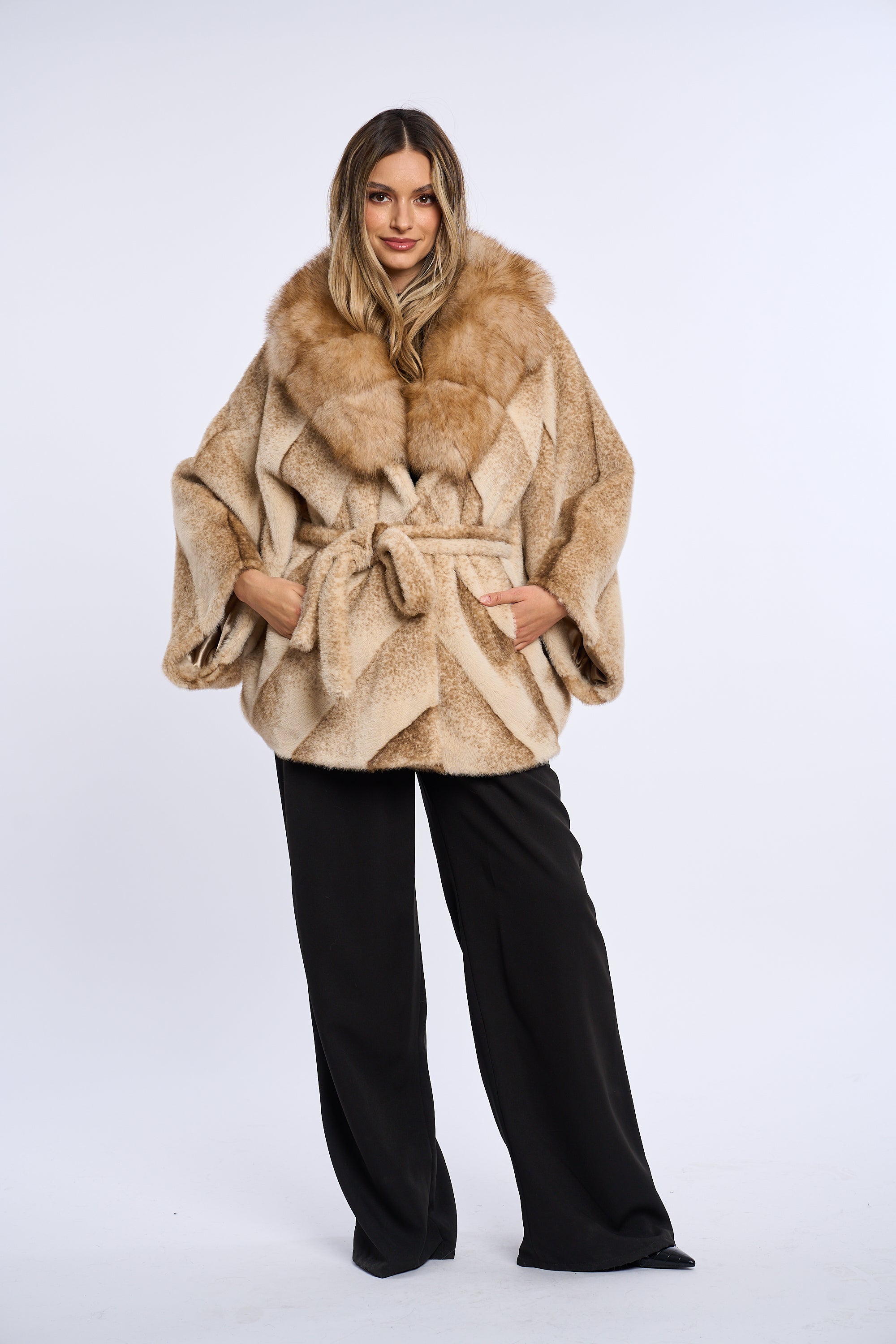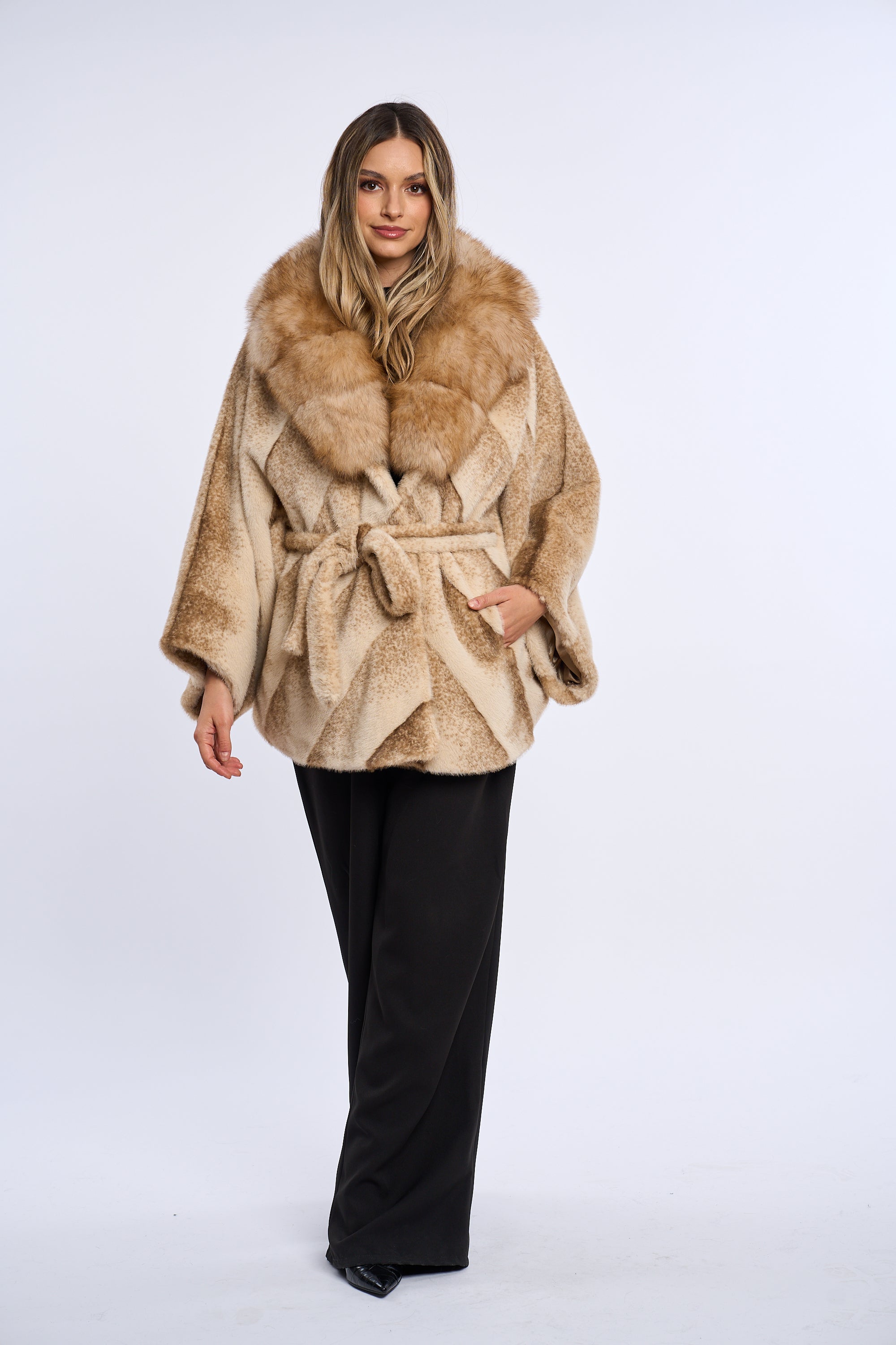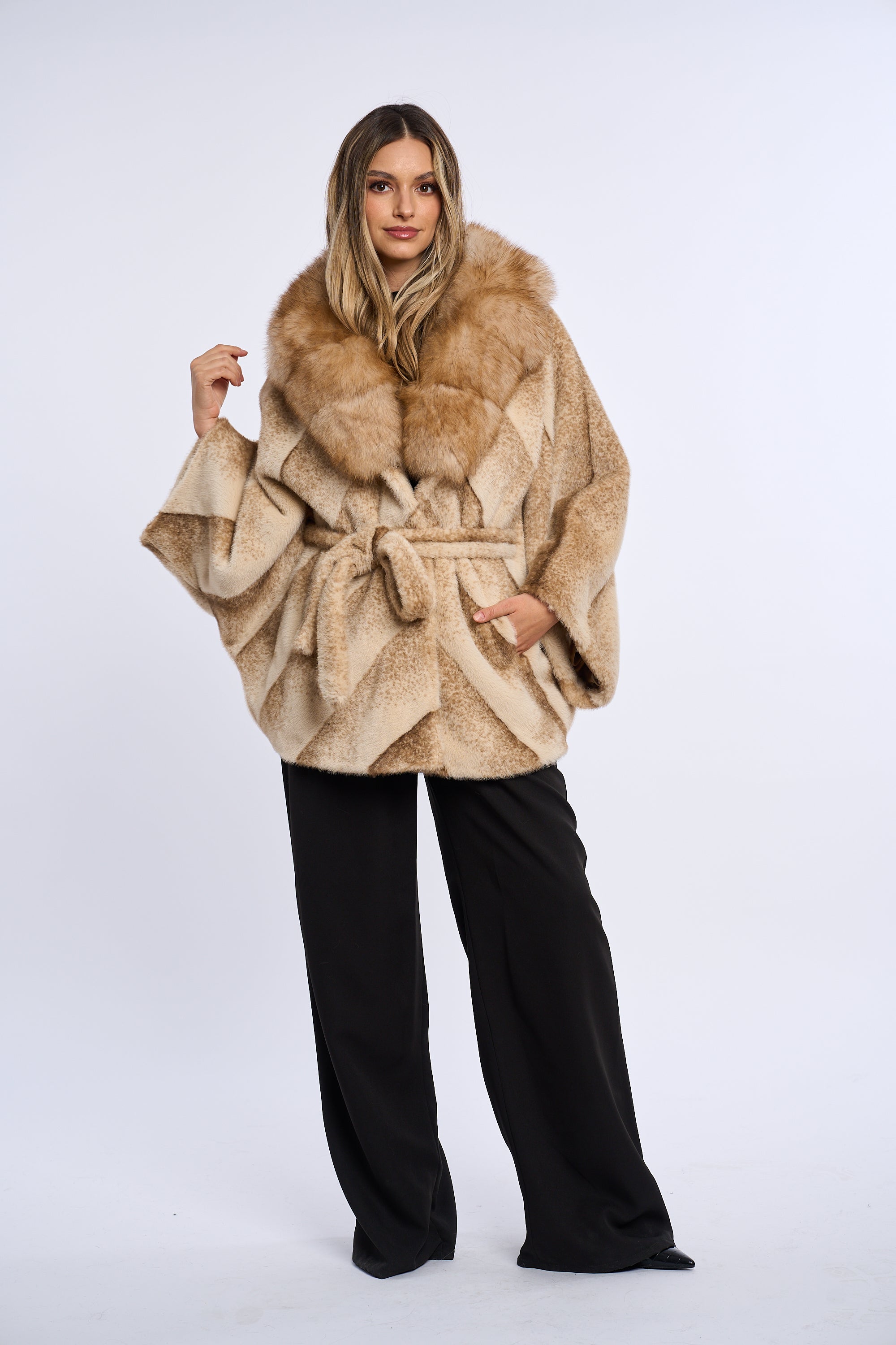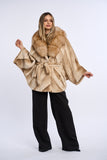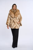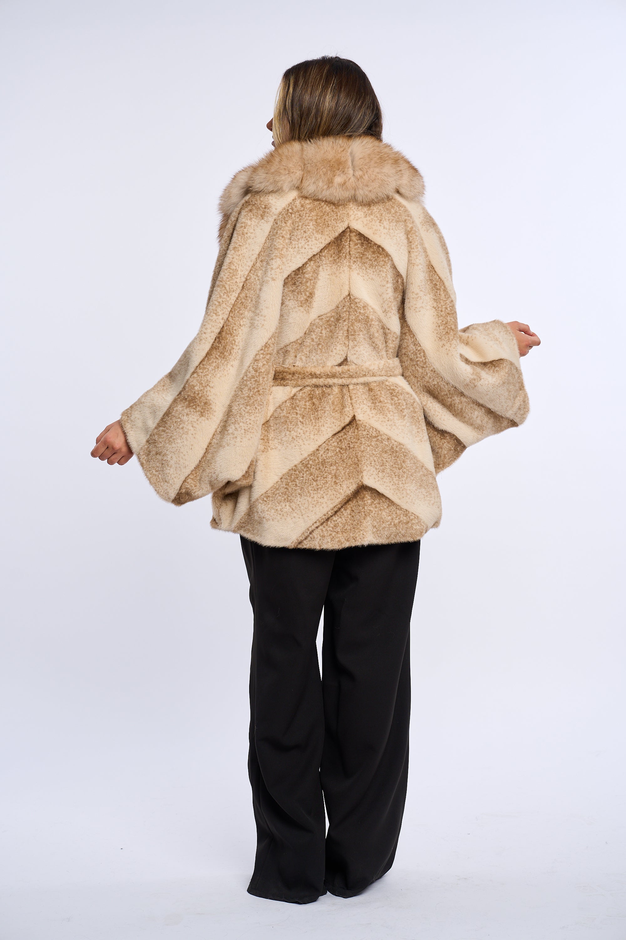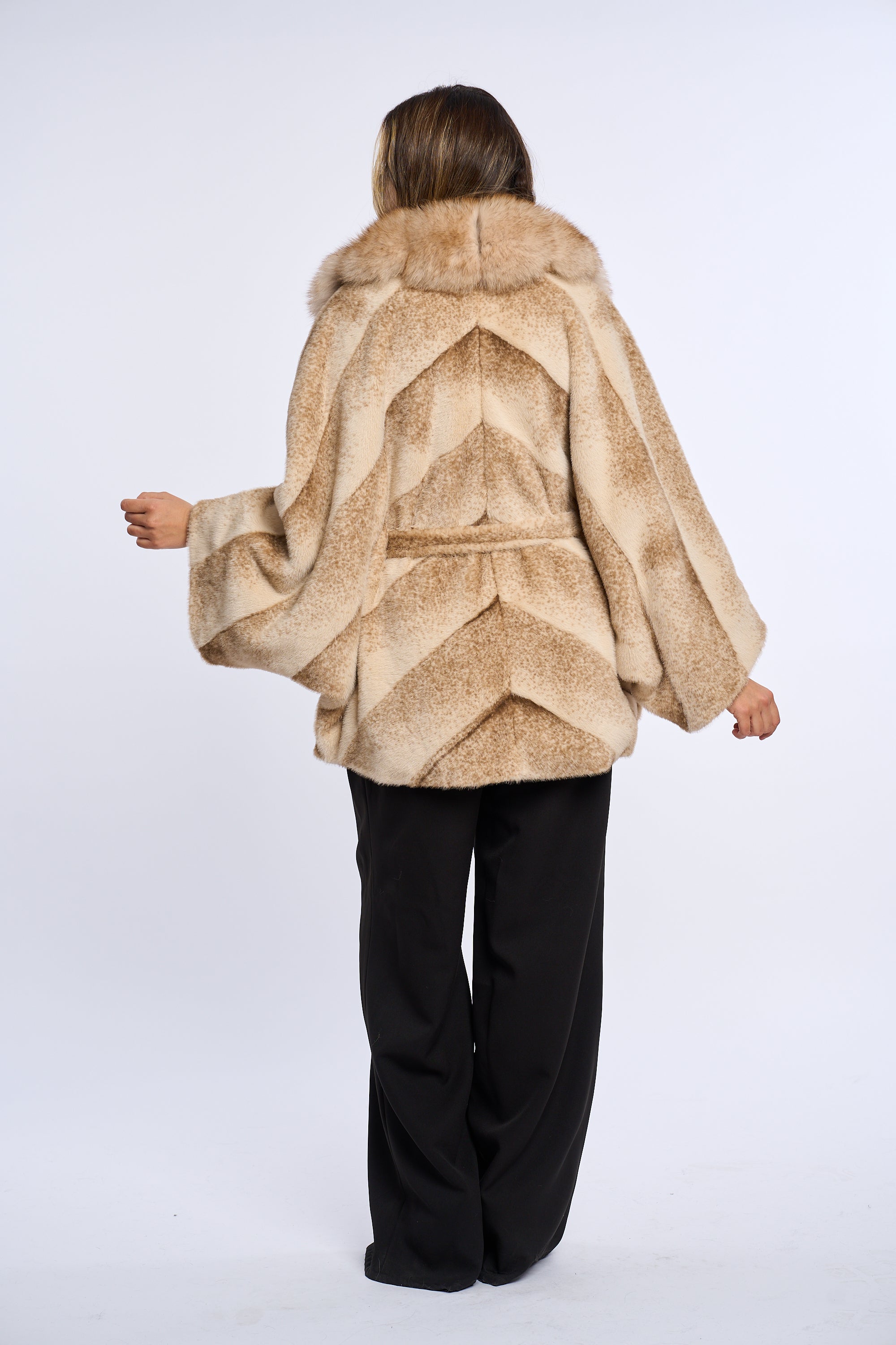 Acest palton este confectionat din alcantara, accesorizat cu o bogata garnitura de vulpe.